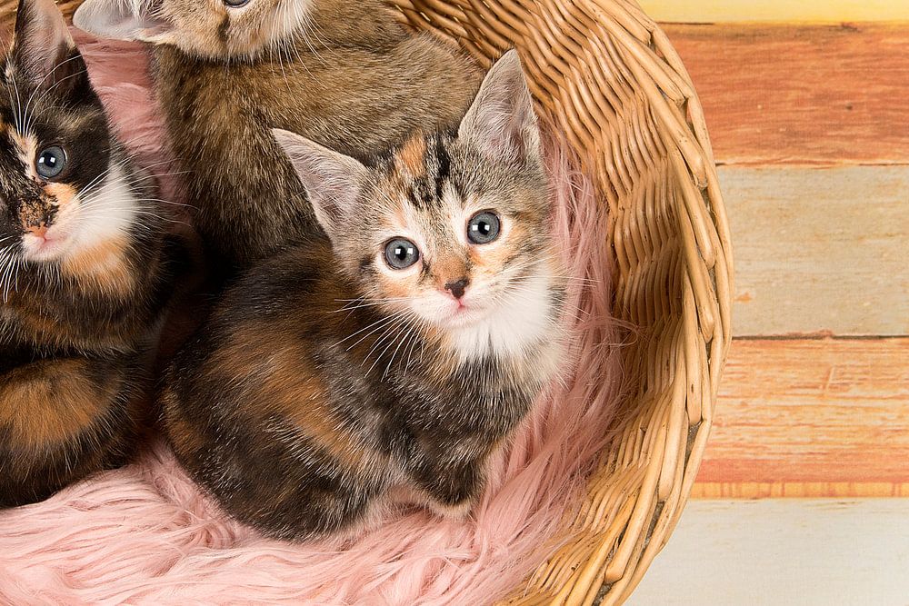 Trois mignons bébés chatons dans un panier en osier, regardant en hauteur sur un fond de bois aux couleurs pastel
