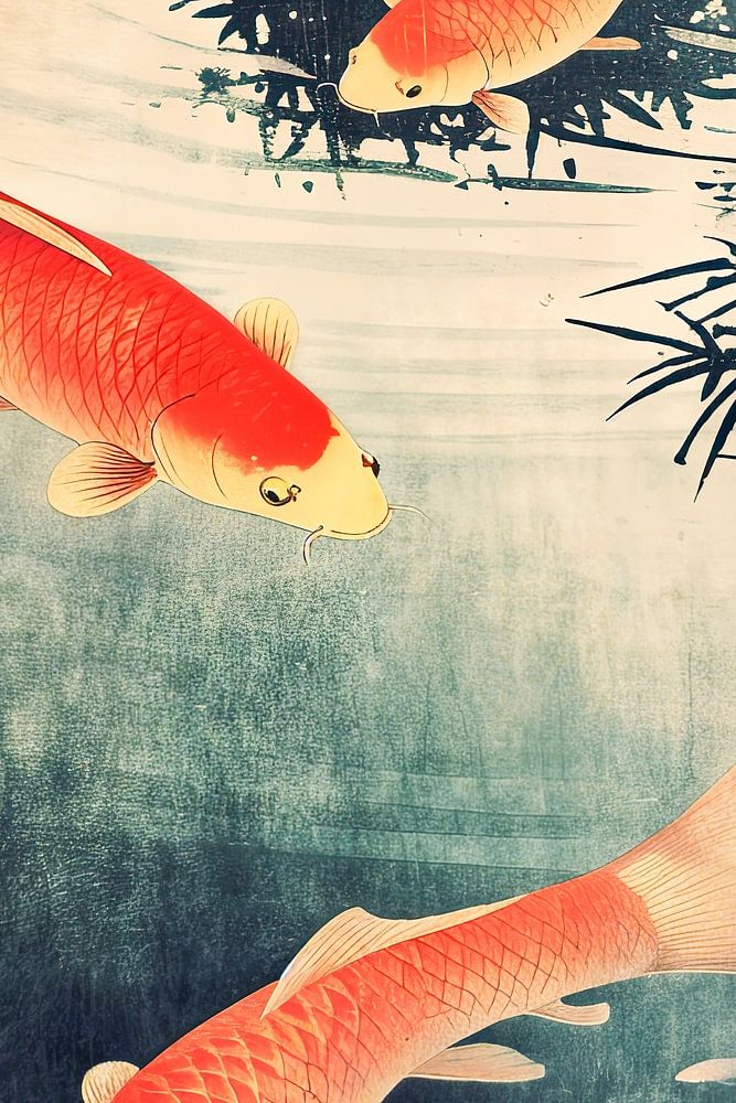 Une gravure de nature représentant trois carpes koï dans un étang de style asiatique.