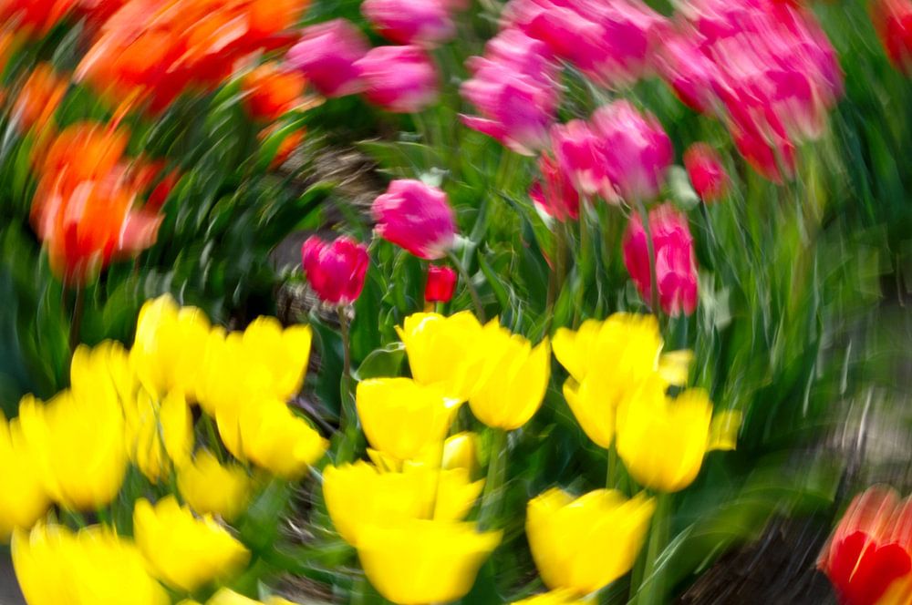 Een opname in de Hortus Bulborum te Limmen, waarbij de camera tijdens de opname om zijn as is gedraaid om de verschillende kleuren en vormen van tulpen, die vlak naast elkaar staan, in één compositie te doen samensmelten.