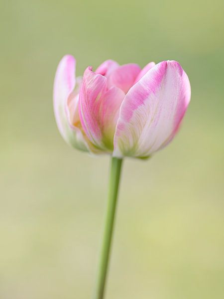 Une tulipe rose sur fond vert tendre. Profitez de cette tulipe fraîche à floraison précoce, qui annonce l'arrivée d'un beau printemps.