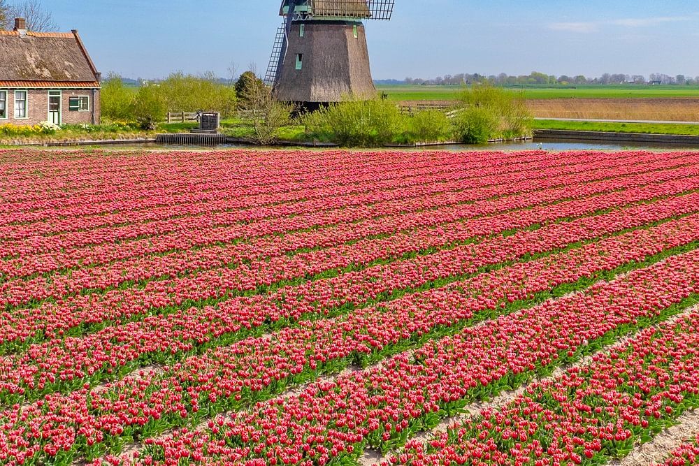 Tulipes en fleurs dans un champ au printemps, avec un vieux moulin à vent hollandais traditionnel à côté du champ. Le champ de tulipes est situé en Hollande-Septentrionale, l'une des régions les plus connues des Pays-Bas pour ses champs de tulipes. Vue d'en haut.