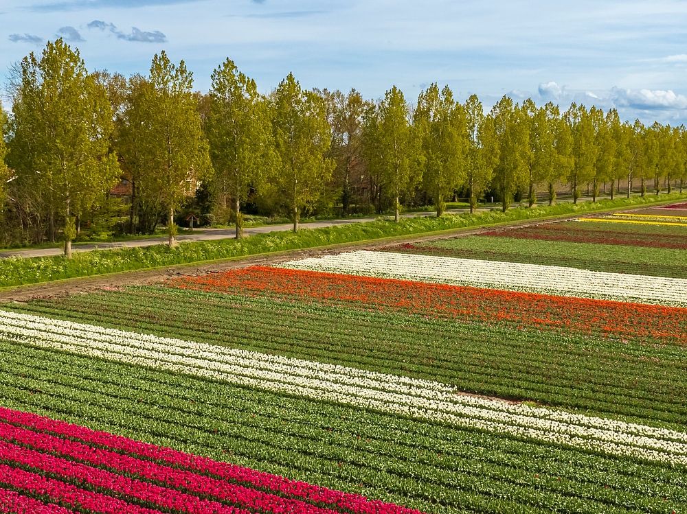 Des tulipes roses, blanches et rouges poussent dans des champs agricoles du Flevoland, aux Pays-Bas, au printemps, vues d'en haut. Le Flevopolder est un polder de l'ancienne Zuiderzee conçu à l'origine pour créer davantage de terres agricoles. Il s'agit de l'une des plus grandes zones de culture de bulbes à fleurs des Pays-Bas...