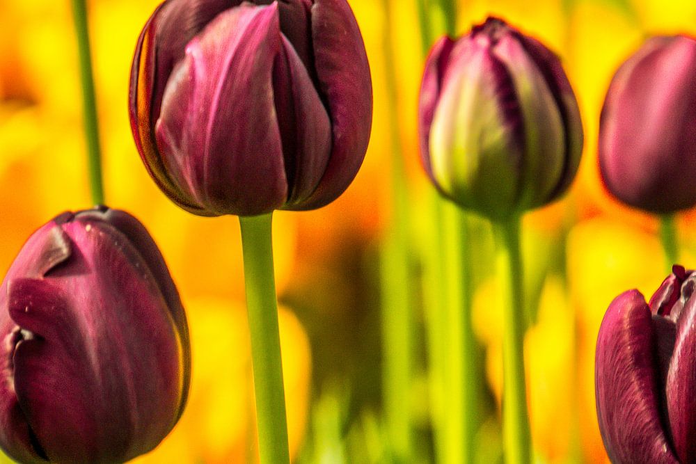 De belles tulipes violettes qui se tenaient dans un champ pour différentes couleurs de tulipes. Les tulipes jaunes sont bien visibles à l'arrière-plan. Cela rend également les tulipes violettes très belles.