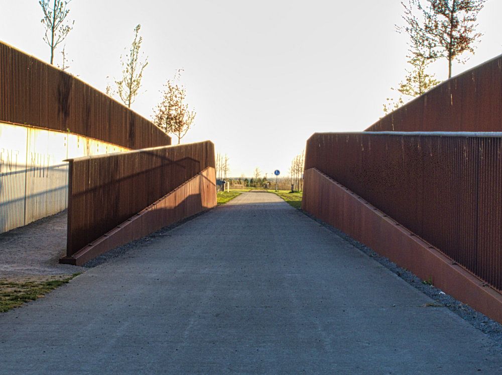 La photo montre un élégant chemin en béton qui s'étend entre deux murs. Les bords supérieurs des murs sont recouverts de panneaux métalliques rouillés, ce qui ajoute une touche industrielle et moderne. Des branches et des feuilles d'arbres dépassent des murs, offrant un beau contraste entre la nature et l'architecture.