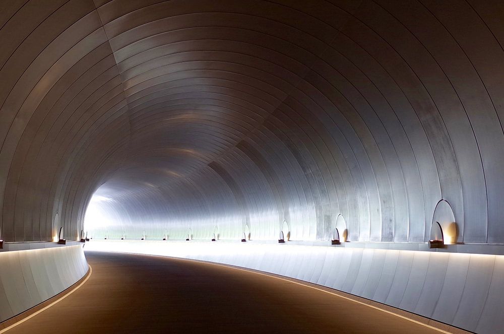 Le tunnel semble vide, sans véhicules ni piétons, ce qui donne une impression de sérénité et de calme. Une sortie bien éclairée est visible au bout du tunnel, ce qui donne un sens de direction et d'ouverture à la scène. La conception de ce tunnel met l'accent sur la simplicité, l'efficacité et une esthétique sophistiquée. Un exemple fascinant d'architecture moderne !