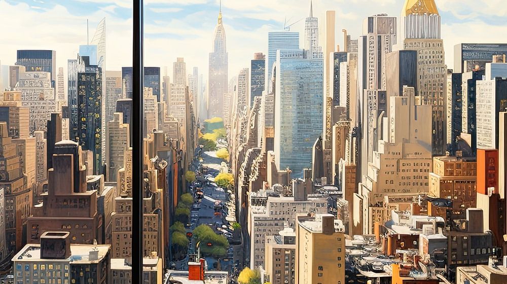 Une vue extraordinaire d'une grande ville depuis un gratte-ciel, par une journée ensoleillée. Les bâtiments, de tailles différentes, surgissent du sol et forment ensemble le centre de la ville.