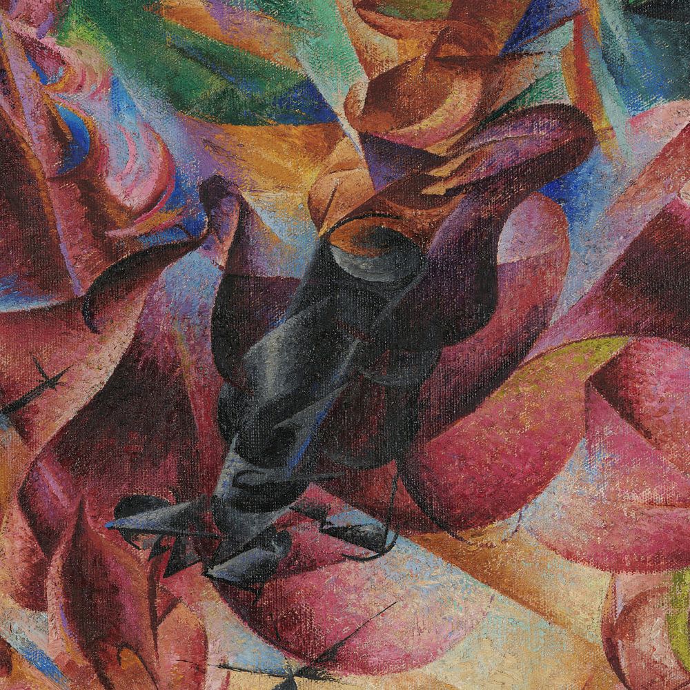 L'élasticité. Le paradigme de la distinction entre futuristes et cubistes. Un chevalier galopant sur un cheval dans un décor urbain révèle le nouvel intérêt pour les propriétés des choses, et en particulier pour l'élasticité des objets et des muscles, anticipant l'interprétation musculaire du mouvement typique de la "dynamique" de la sculpture.