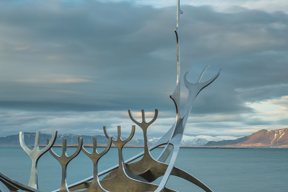 Un bel après-midi au Sun Voyager à Reykjavik, en Islande. Une statue en forme de bateau viking