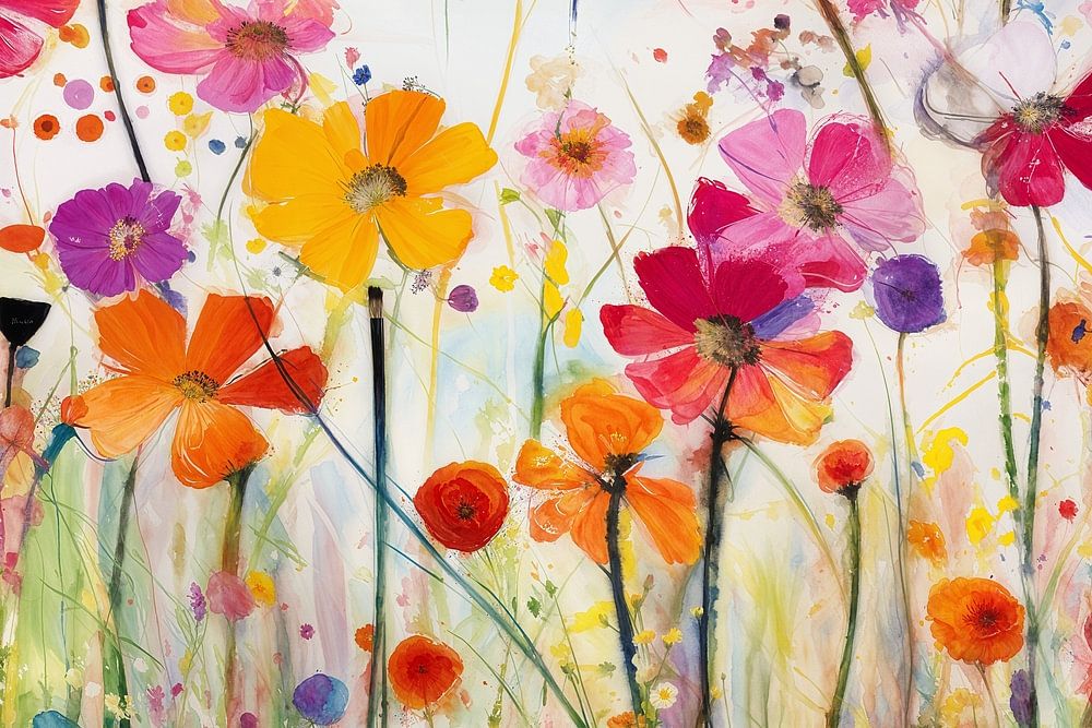 Un champ de fleurs. Peinture moderne et abstraite colorée d'une collection de fleurs de toutes les couleurs. Apportez de la gaieté dans votre maison avec cette œuvre !