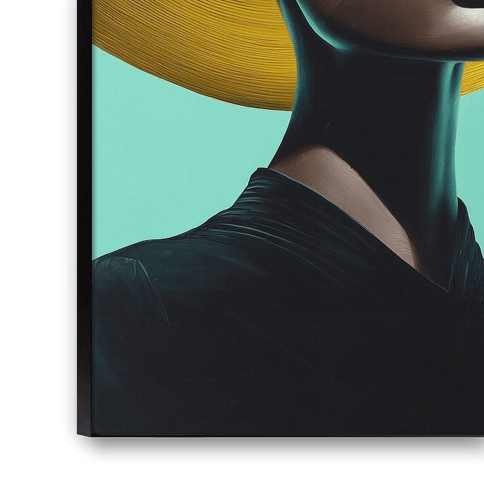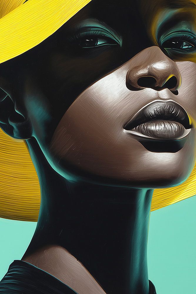 Une femme élégante portant un énorme chapeau jaune capture la lumière d'une manière presque sculpturale. La composition est puissante, moderne et confiante.
