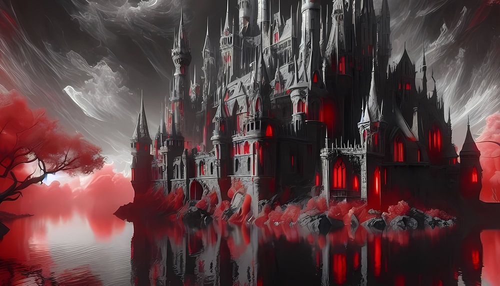 Ce tableau d'art captivant représente un château majestueux qui trône paisiblement au milieu d'une forêt rouge et dense. Les arbres sont peints dans des nuances profondes de rouge et d'orange, ce qui crée une atmosphère chaleureuse et accueillante. Le château, avec ses hautes tours et ses détails en filigrane, contraste de manière impressionnante avec les couleurs vives de la nature. Une douce brume enveloppe la scène et confère à l'image une note mystique, comme si elle était sortie d'un conte de fées. Cette composition invite le spectateur à se plonger dans un monde plein de fantaisie et de magie.