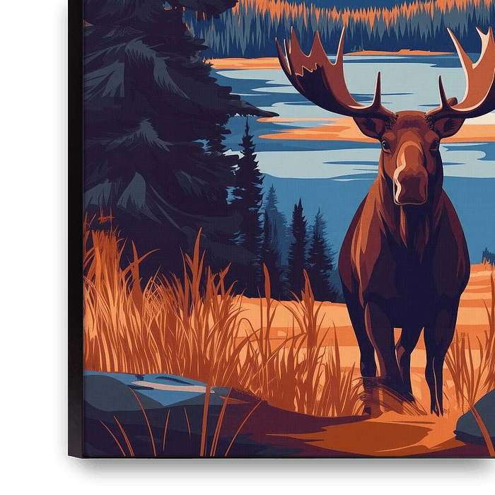 Cette image montre un élan imposant qui occupe le devant de la scène dans un paysage de montagne à couper le souffle. L'élan est entouré de grands pins, de montagnes sereines aux sommets enneigés et d'un lac scintillant en arrière-plan. Les tons chauds de l'herbe et les couleurs d'automne contrastent magnifiquement avec les bleus froids…