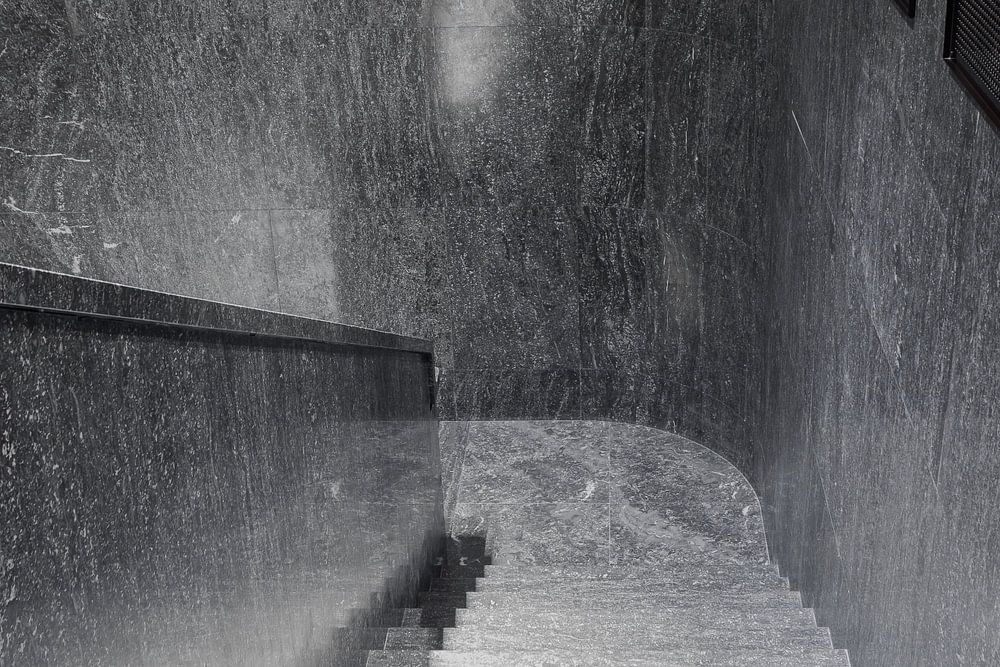 Tout en haut d'un bâtiment, il y a un bel escalier en marbre.