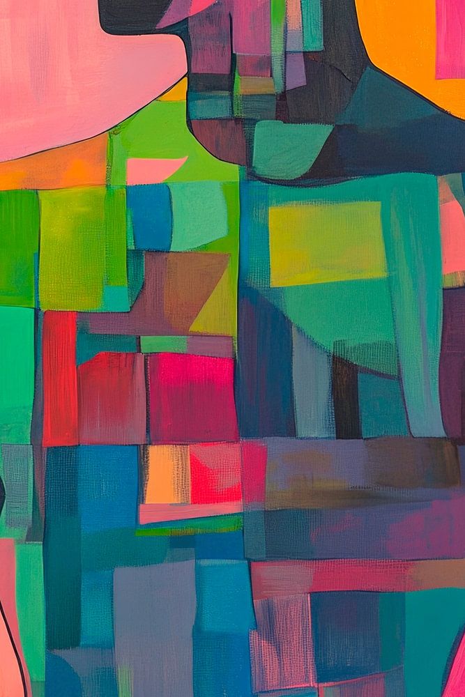 Dans des couleurs éclatantes et des formes géométriques, la silhouette d'un corps humain se déploie, alliant l'art moderne à une touche d'abstraction. Cette représentation vivante de la forme pourrait parfaitement s'intégrer dans un salon, où elle attirerait l'attention et servirait de sujet de conversation impressionnant, tout en égayant l'atmosphère et en encourageant la créativité.