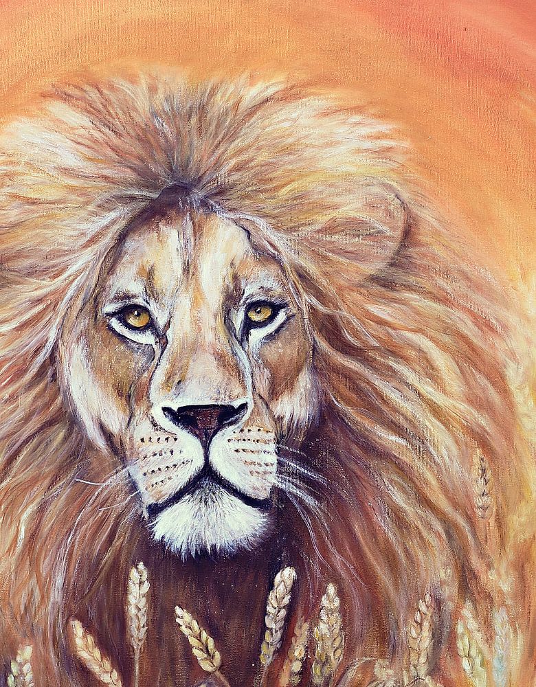 peinture à l'huile d'un lion dans un champ de récolte... l'image du lion que je trouve appropriée en ce temps de couronne.