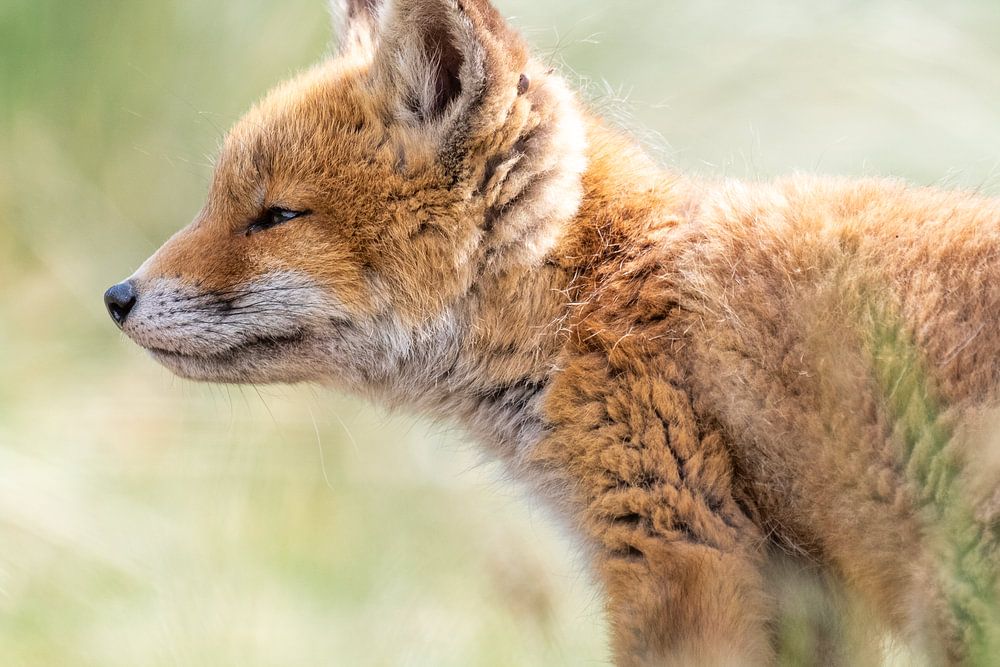 Jeune renard dans les hautes herbes des AWD. Lors d'une promenade dans les Amsterdam Water Supply Dunes, je suis tombé sur un groupe de jeunes renards avec une mère. De loin, nous pouvions observer tranquillement cette mère et ces jeunes renards. En utilisant un téléobjectif et en photographiant au ras du sol, l'herbe au premier plan donne un effet quelque peu " rêveur ".