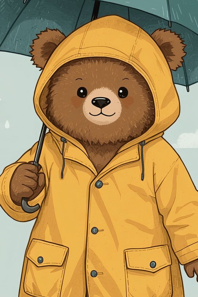 Ours de dessin animé vêtu d'un imperméable jaune et tenant un parapluie bleu-vert, avec des gouttes de pluie sur le fond bleu clair.