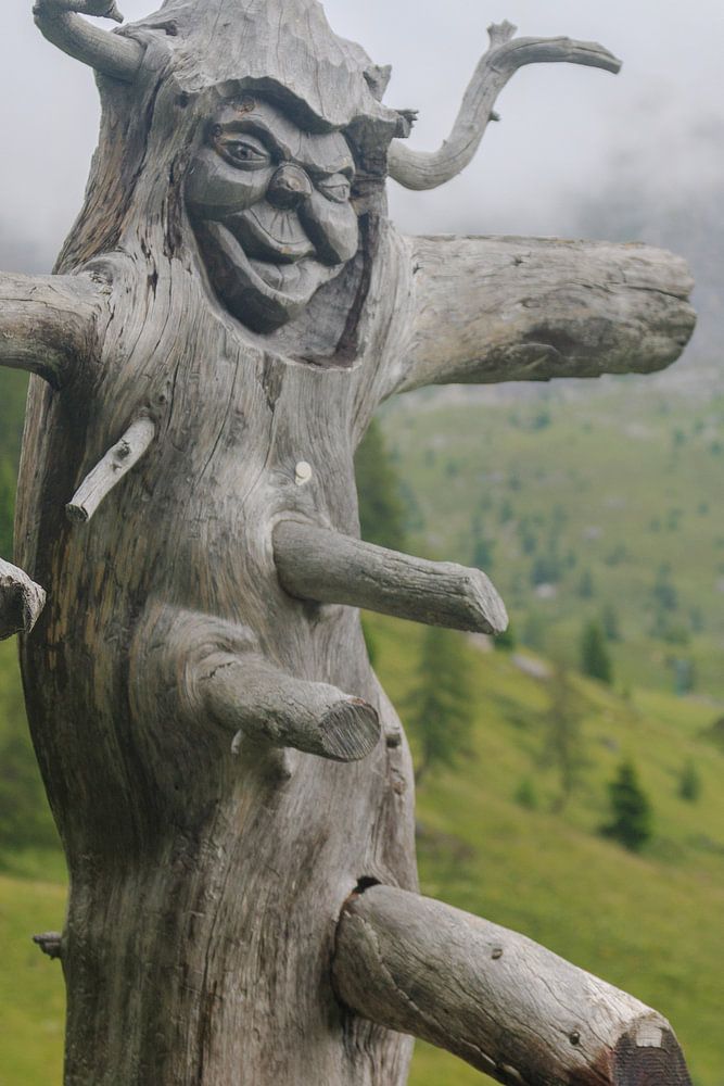 Source d'un refuge de montagne dans les dolomites, avec de l'eau provenant d'une sculpture en bois en forme de petit diable.
