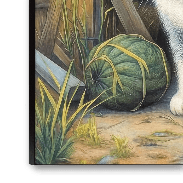 Un chat gris et blanc aux yeux verts remarquables se tient à l'entrée d'un hangar en bois rustique, entouré de plantes vertes et d'outils de jardin. La scène évoque un sentiment de curiosité et de vie paisible à la campagne.
