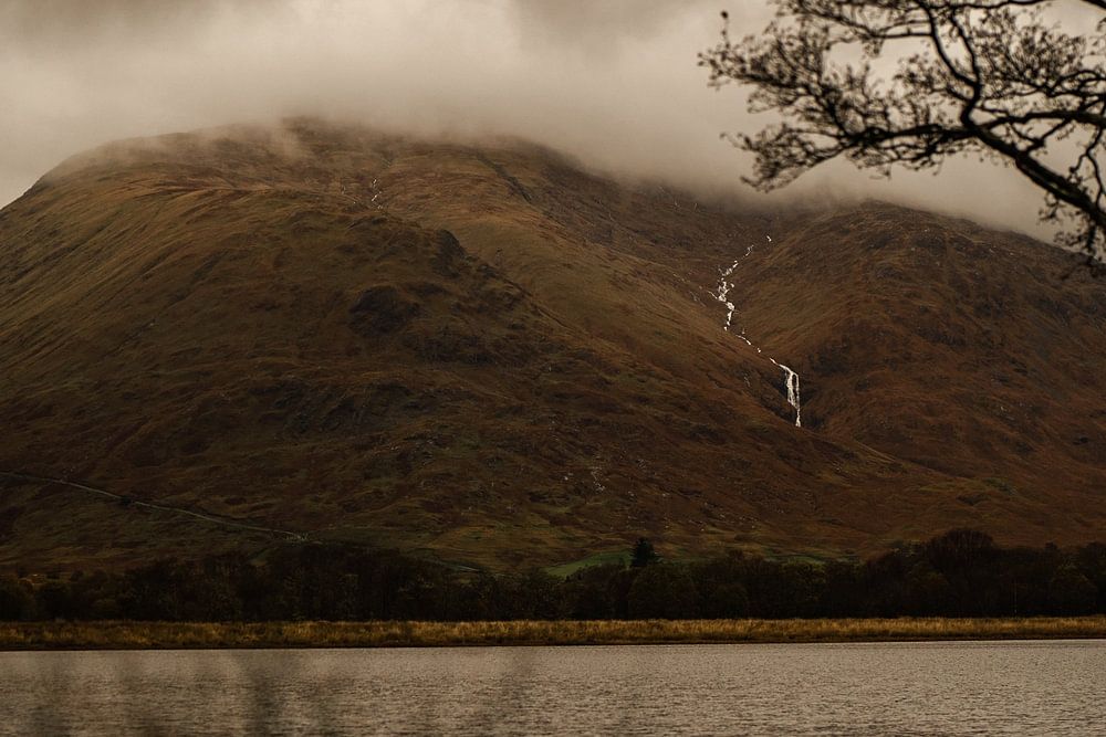 Un loch (lac), une montagne avec des chutes d'eau et un ciel gris terne.