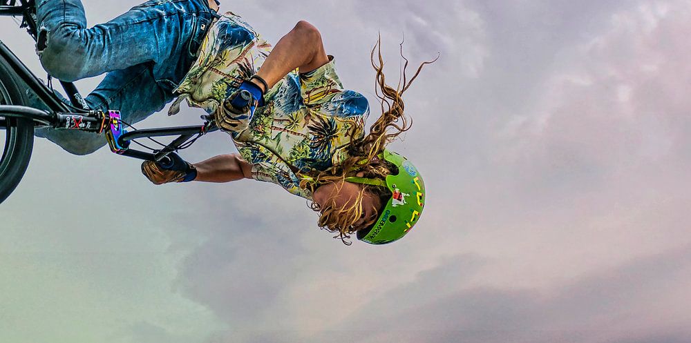 Un saut audacieux sur le vélo. Photographié dans un ciel magnifique. Ce type n'a pas peur de prendre son vélo. Il a fait un saut périlleux fantastique. Descendez de haute altitude et faites une cascade. C'est là le défi. Ravi de vous voir. (Sous lui se trouvait un grand coussin, mais je l'ai laissé en dehors de l'image pour le rendre plus spectaculaire.)