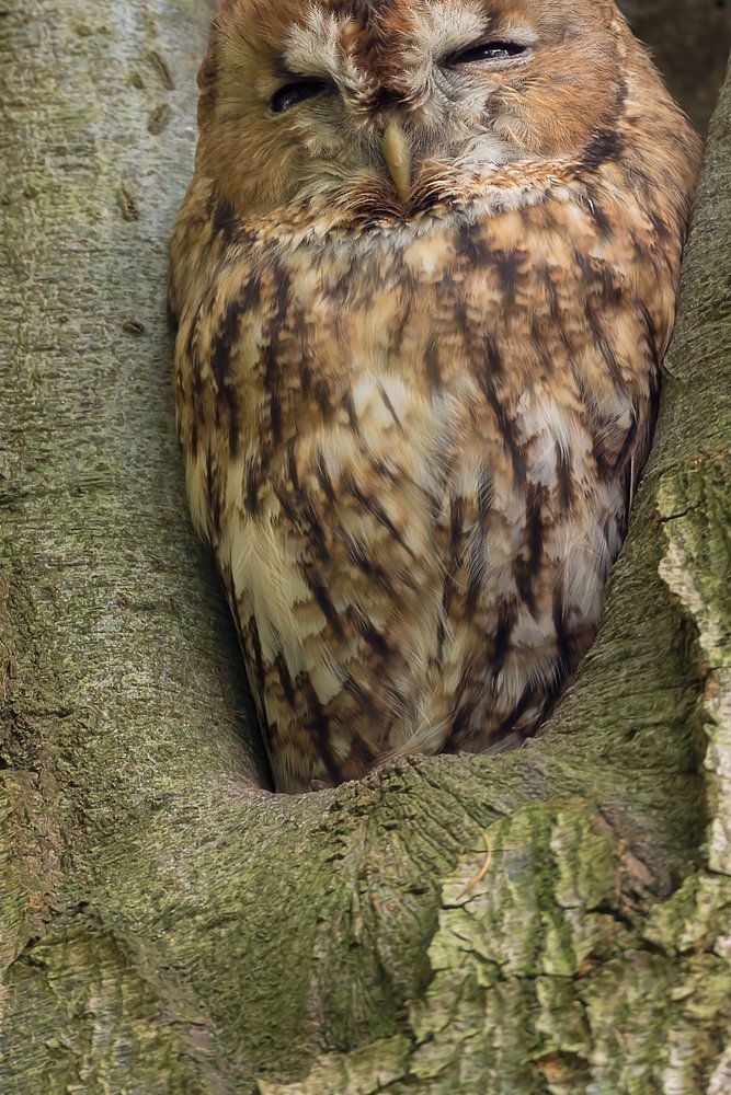 La chouette hulotte est assise dans son nid dans son arbre, observant prudemment le photographe avec des yeux à demi ouverts.