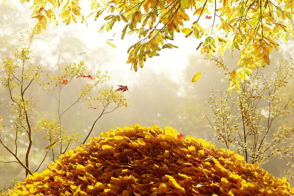 Une lumière dorée illumine les tas de feuilles et les arbres