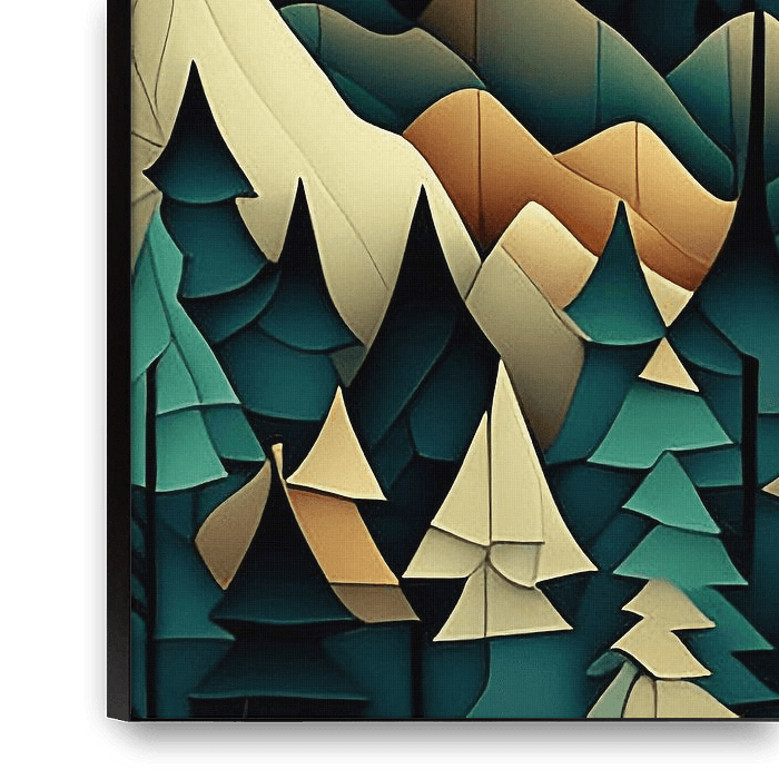 Cette œuvre d'art captivante représente une chaîne de montagnes stylisée et une forêt sous-jacente, où des motifs géométriques se mêlent à des dégradés de couleurs vives dans des tons de terre et de vert. Les sommets élevés dans des tons orange ardents forment un contraste dramatique avec les tons verts et bleus froids de la forêt dense…