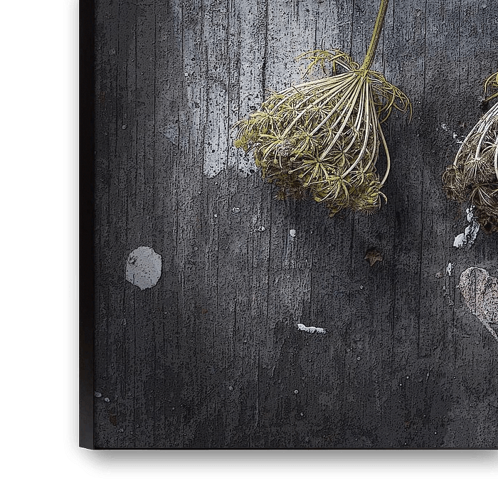 Photo traitée de 3 fleurs séchées sur le bord de la route. Photographié sur une table de peinture. Une trinité avec d'infimes différences. Le carré découpé, une pièce maîtresse dans chaque salon ou cuisine.
