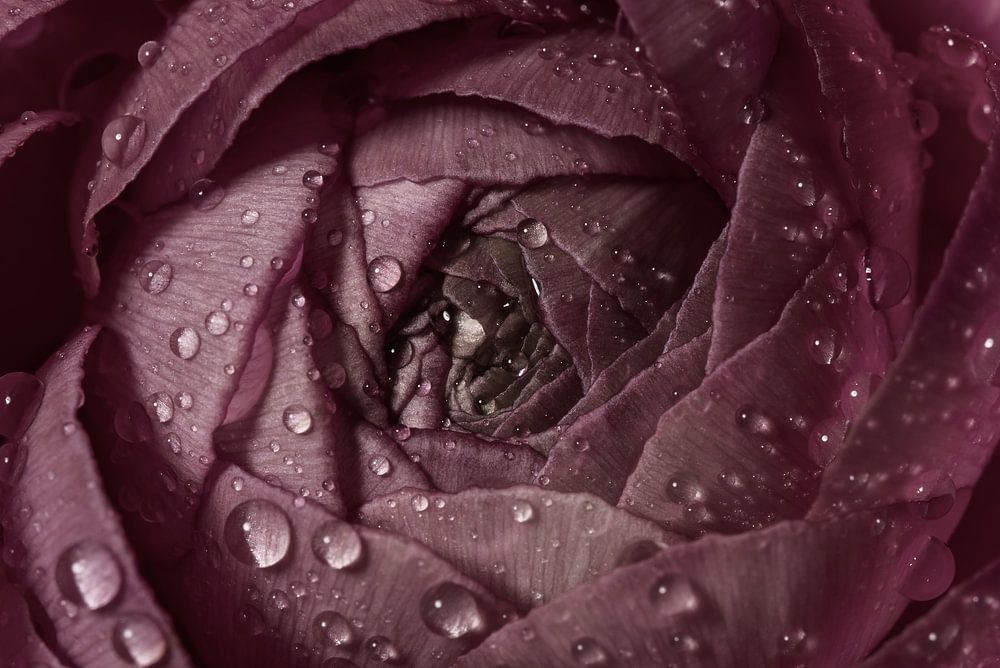 "ne renoncule rose ancienne avec des gouttes d'eau s'ouvre lentement." est une photo macro éditée d'une renoncule rose avec des pétales qui ne se sont pas encore tous ouverts. Sur ces pétales se trouvent des gouttes d'eau.