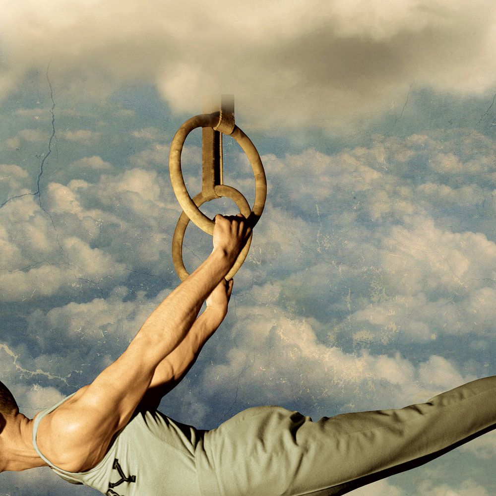 Surréaliste, interprétation vintage d'un athlète sur des anneaux, sur un nuage.