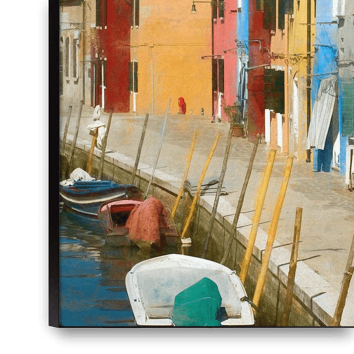 Photographie de quelques façades de maisons à Burano, Italie. Le traitement de l'image des maisons colorées de Burano a été inspiré de la peinture à l'huile, créant ainsi un effet pictural.