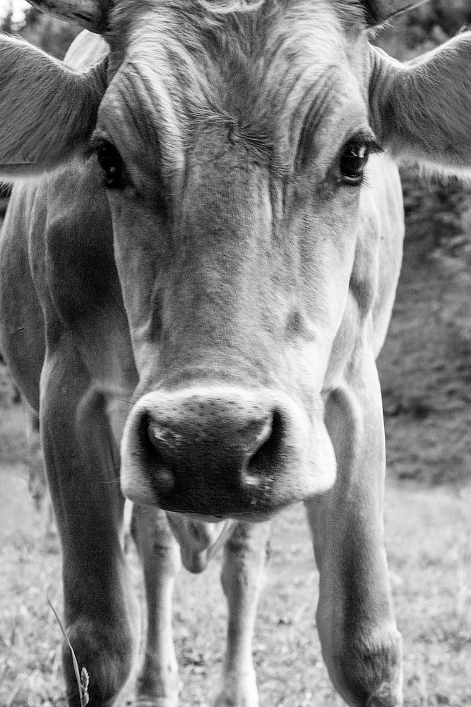 Jeune vache curieuse ; motif de la série de photos sur la vache "Menschlich" par Anna Köhne ; photographie en noir et blanc