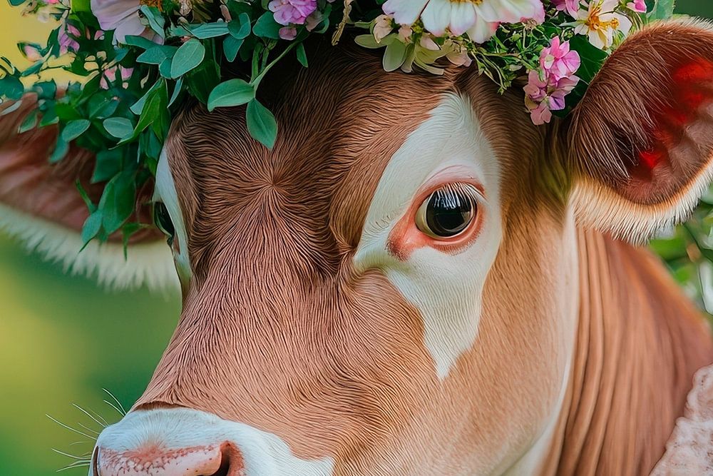 Un morceau enchanteur d'idylle rurale : une charmante vache avec une magnifique couronne de fleurs, entourée de lumière naturelle et d'accents floraux. Sa grâce enjouée attire tous les regards. Parfaite comme joyeux point d'orgue dans la cuisine ou le salon, elle apporte une touche de romantisme campagnard et d'énergie positive dans chaque pièce.