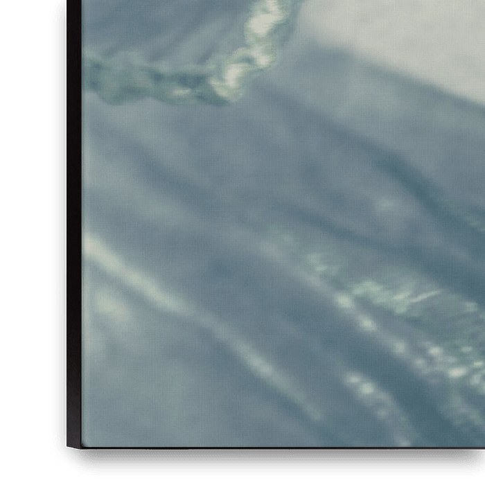 Cette œuvre présente un gros plan abstrait d'un tissu délicat et translucide aux bords ondulés, presque flottants. Les couleurs oscillent entre le bleu clair et le turquoise, traversées par une fine lueur qui reflète doucement la lumière. L'inspiration pour ce tableau a été l'observation du mouvement et de la lumière dans des matériaux…