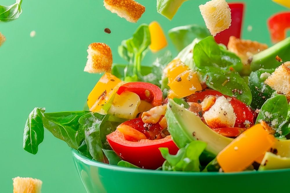 Des couleurs fraîches dansent dans l'air et s'unissent pour former une fête vivante de légumes. Des cubes de pain croustillants et des feuilles vertes croquantes se mêlent à des poivrons lumineux, tandis que la dynamique excitante de cette scène rayonne d'énergie et de vitalité. Cette œuvre d'art s'intègre parfaitement dans toutes les cuisines et constitue un point fort accueillant et sain pour chaque pièce.