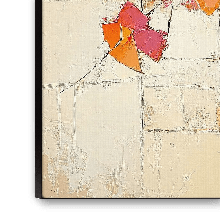 Vase de fleurs | Fleurs abstraites - Ce tableau de fleurs abstraites représente un vase contenant des fleurs vibrantes et colorées dans les tons orange, rouge et violet, placées sur un fond jaune doux et texturé, dégageant un sentiment de calme et de douceur.