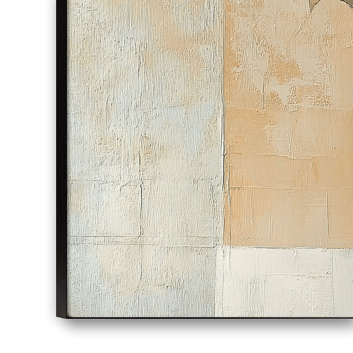 Vase de fleurs - Ce tableau de fleurs représente un vase minimaliste avec de délicates fleurs blanches, accentué par un arrière-plan de tons pastel doux et de plans géométriques abstraits.