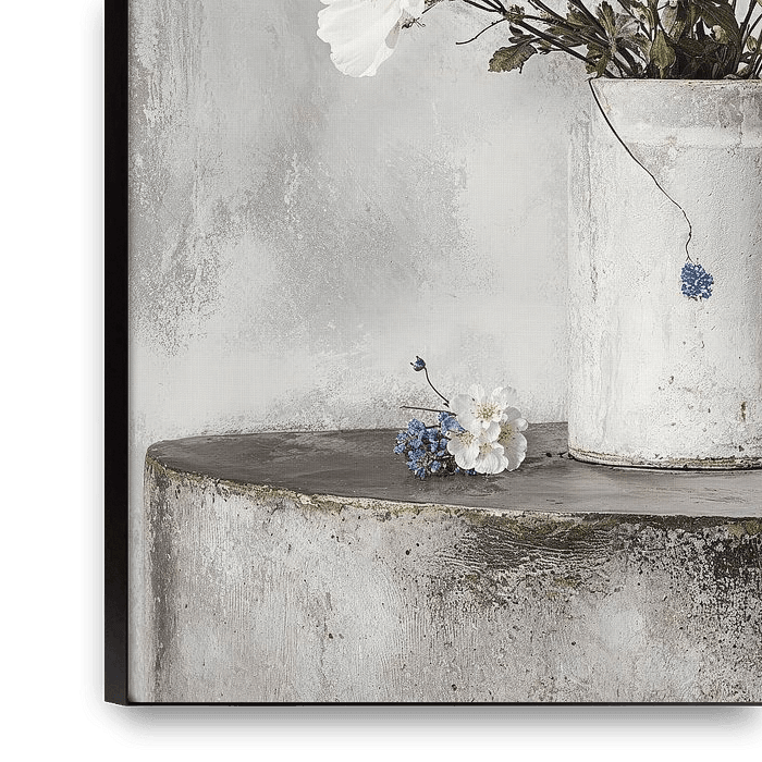 Vase avec des fleurs blanches et bleues, nature morte. Un accroche-regard particulier pour votre intérieur ! Choisissez la taille et le matériau de cette œuvre et faites-la vôtre. Cette œuvre s'intègre parfaitement dans un intérieur moderne ou rural.