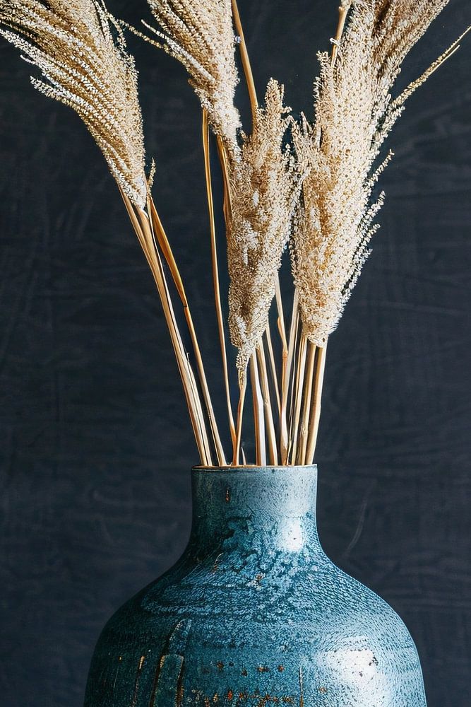 Un magnifique grand vase bleu, richement décoré de subtiles taches d'or, se dresse majestueusement sur une table en bois sombre, contre un tableau noir. À l'intérieur du vase se trouvent de longues tiges d'herbe de la pampa, dont les plumes douces de couleur crème s'élèvent vers le ciel. Cette scène évoque une atmosphère calme et naturelle, idéale pour ajouter un élément élégant et apaisant à tout décor moderne ou classique. Parfaite pour servir de point focal dans un salon ou une salle à manger, où elle apporte beauté naturelle et tranquillité.