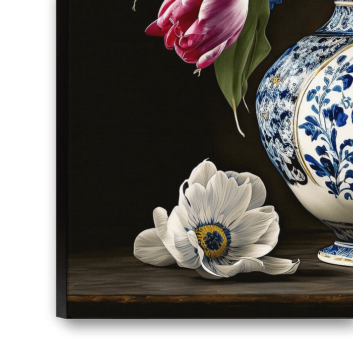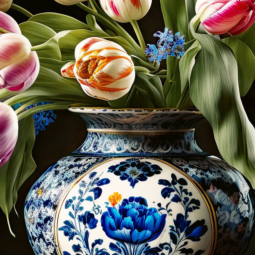 Un portrait floral classique. L'œuvre représente un vase bleu de Delft à l'ancienne contenant un bouquet de tulipes blanc-orange et d'autres fleurs sauvages. L'ensemble se détache sur un fond sombre.