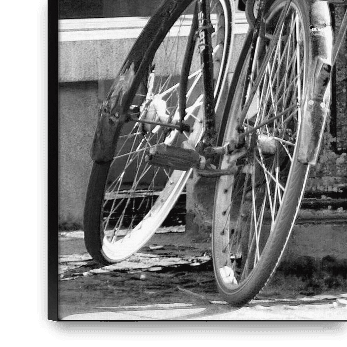 Achetez cette photo Vélo contre poteau avec chaises empilées par Marion Hesseling sur toile, aluminium, ArtFrame ou photographie (encadrée), impression d'art en haute qualité et tout format.
