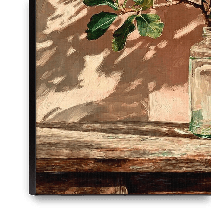 Un arrangement botanique frais se tient gracieusement à l'intérieur d'une bouteille en verre transparent. Une douce lumière naturelle met en valeur les formes et les textures organiques. Les tons chauds de l'arrière-plan créent une atmosphère calme et accueillante. La composition est équilibrée, élégante et intemporelle. Cette œuvre…
