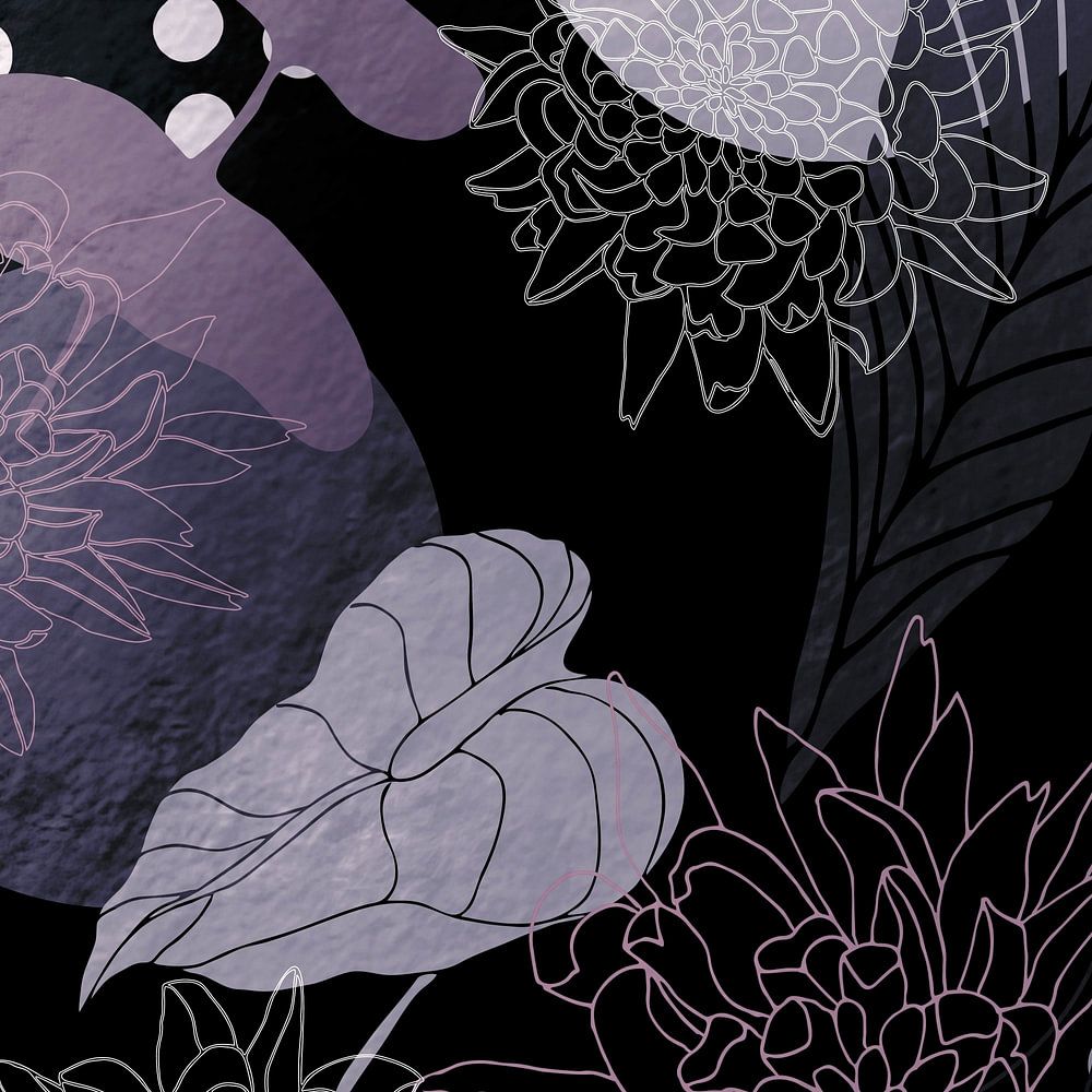 Achetez cette œuvre d'art florale Vibrations botaniques de nuit violettes avec lunes, fleurs et feuilles. Couleurs lilas, bleu, argent par Dina Dankers sur toile, aluminium, ArtFrame ou photographie (encadrée), impression d'art en haute qualité et tout format.