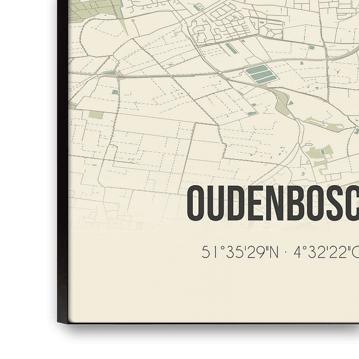 Carte rétro d'Oudenbosch, située dans la commune d'Halderberge, province du Brabant septentrional. La carte montre les routes publiques, les cours d'eau (lacs, ruisseaux et fossés) et les forêts dans et autour de Oudenbosch. En outre, la carte contient les coordonnées d'Oudenbosch.