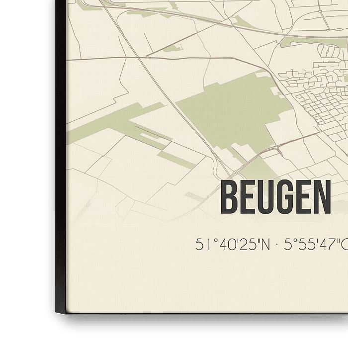 Carte rétro de Beugen, située dans le Peel, dans la commune de Boxmeer, province du Brabant-Septentrional. La carte montre les routes publiques, les cours d'eau (lacs, ruisseaux et fossés) et les forêts dans et autour de Beugen. En outre, la carte contient les coordonnées de Beugen.