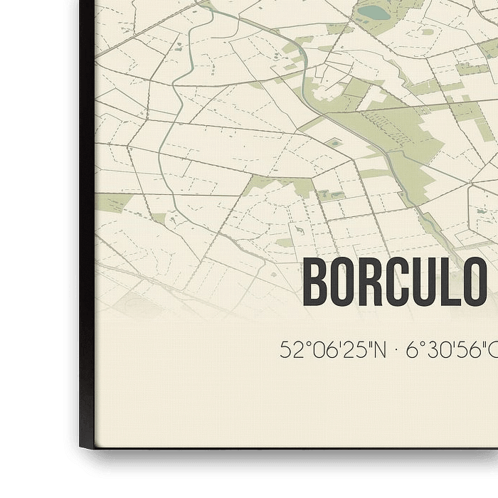 Carte rétro de Borculo, située dans la région d'Achterhoek, dans la commune de Berkelland, province de Gelderland. La carte montre les routes publiques, les cours d'eau (lacs, ruisseaux et fossés) et les forêts dans et autour de Borculo. En outre, la carte contient les coordonnées de Borculo.