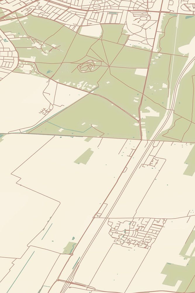 Carte rétro du Hollandsche Rading, situé dans la commune de De Bilt, province d'Utrecht. La carte montre les routes publiques, les cours d'eau (lacs, ruisseaux et fossés) et les forêts dans et autour de Hollandsche Rading. En outre, la carte contient les coordonnées de Hollandsche Rading.