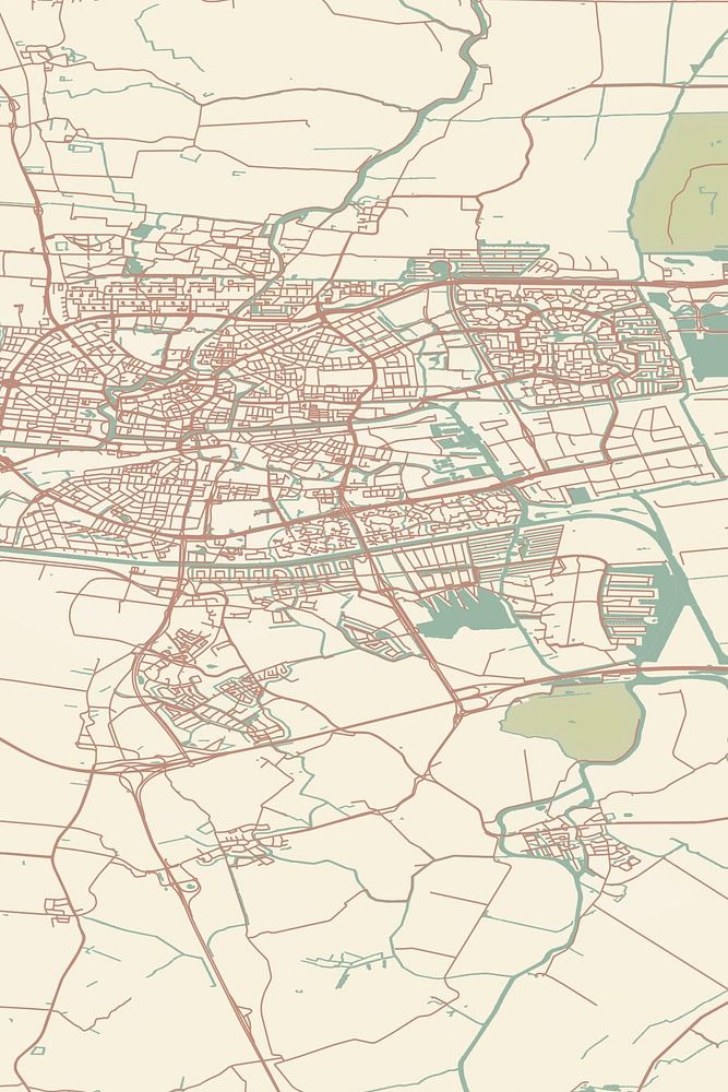 Carte rétro de Leeuwarden, située dans la commune de Leeuwarden, province de Fryslan. La carte montre les routes publiques, les cours d'eau (lacs, ruisseaux et fossés) et les forêts dans et autour de Leeuwarden. En outre, la carte présente les coordonnées de Leeuwarden.