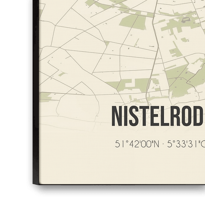 Carte rétro de Nistelrode, située dans la commune de Bernheze, province du Brabant septentrional. La carte montre les routes publiques, les cours d'eau (lacs, ruisseaux et fossés) et les forêts dans et autour de Nistelrode. En outre, la carte contient les coordonnées de Nistelrode.